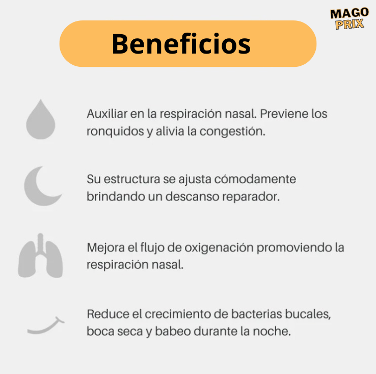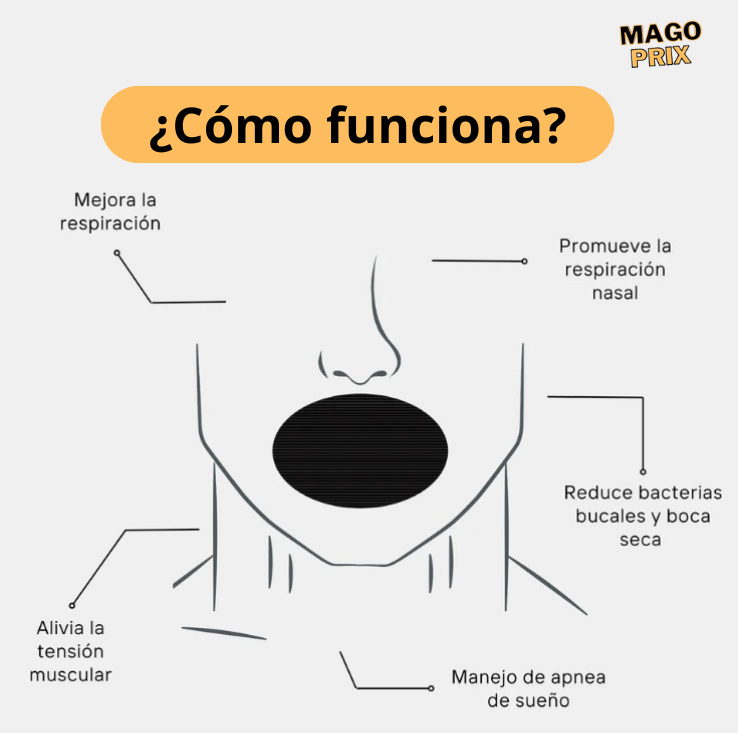 Evita boca seca y bacterias: Promueve una mejor hidratación y salud bucal al cerrar la boca durante el sueño.