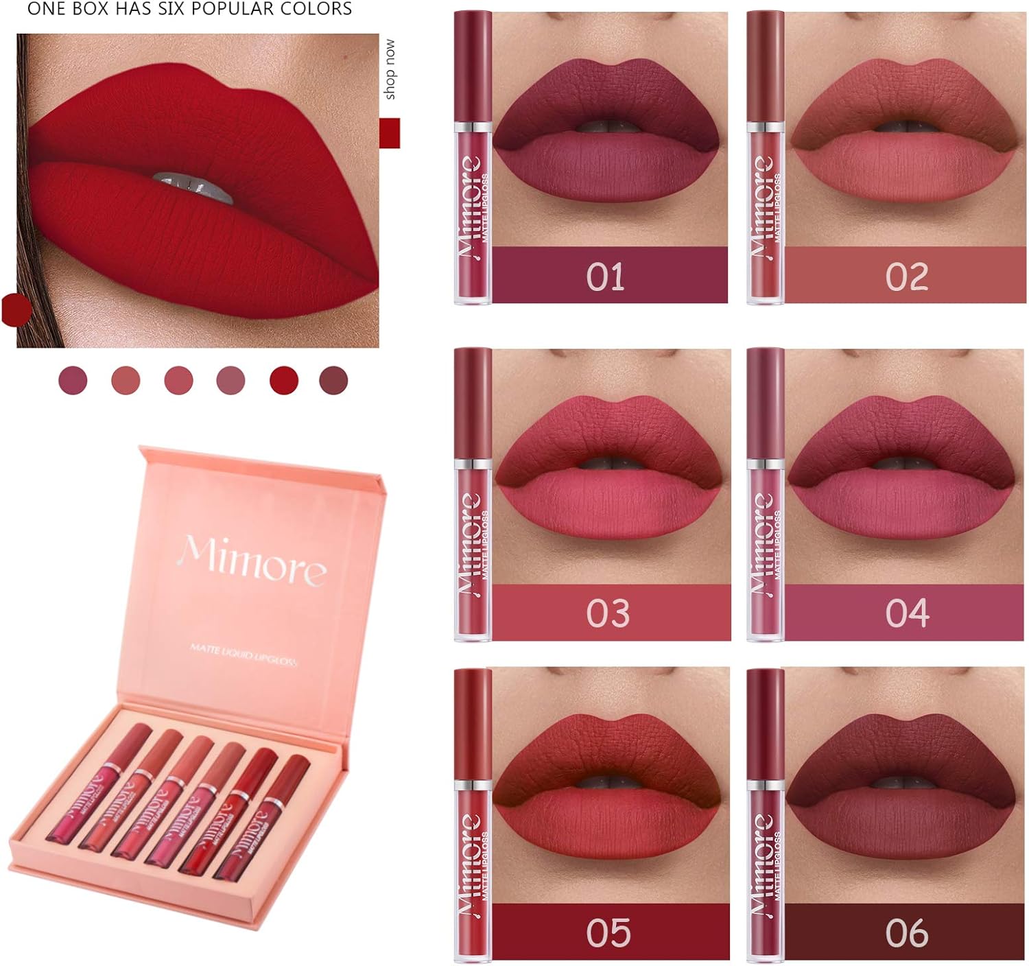 Dale a tus labios el protagonismo que merecen con nuestro el pack de 6 pintalabios mate . Su fórmula impermeable y de larga duración resiste todo: besos apasionados, comidas y largas horas de diversión. Con tonos clásicos que combinan elegancia y estilo, nunca tendrás que preocuparte por retoques. ¡Siéntete segura y fabulosa todo el día!